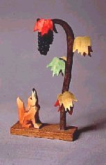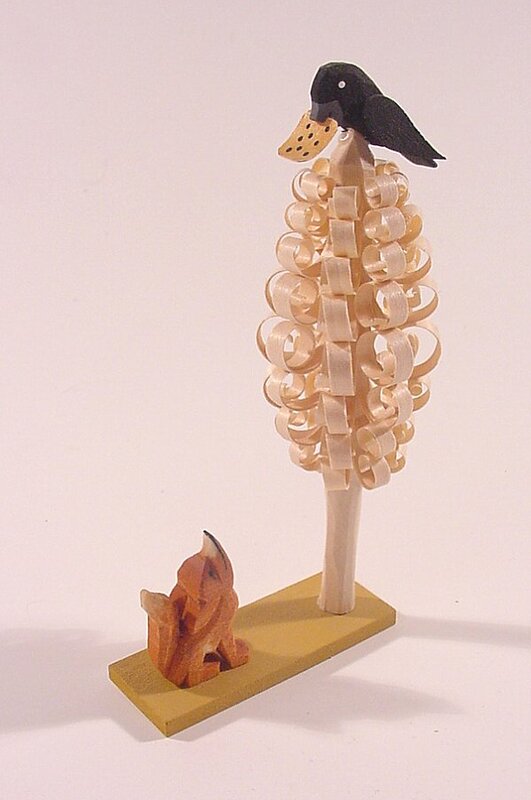 The same attentive fox is back from the earlier (1985?) wooden presentation of FG. Now he looks up at a crow with a slice of swiss cheese in his mouth. The crow is perched on top of a elaborately shaved tree.