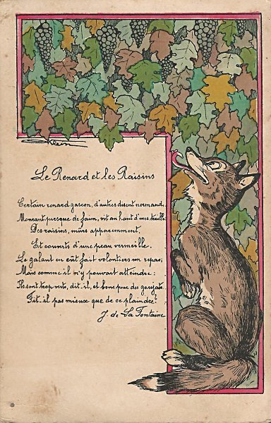 Highly colorful and unusually designed card. The characters extend beyond the L-shaped section for the picture. Longhand presentation of the fable, signed by J. de La Fontaine. Verso is not written upon at all.