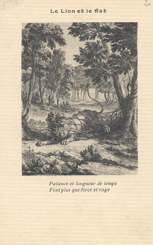 1900? Black-and-white postcard presenting LM. "Patience et longueur de temps/Font plus que force et rage." Illustration after Geeraerts? €4 from ABC de la C.P.A., Lyon, at the Paris Post Card Exhibition, Jan., '05.