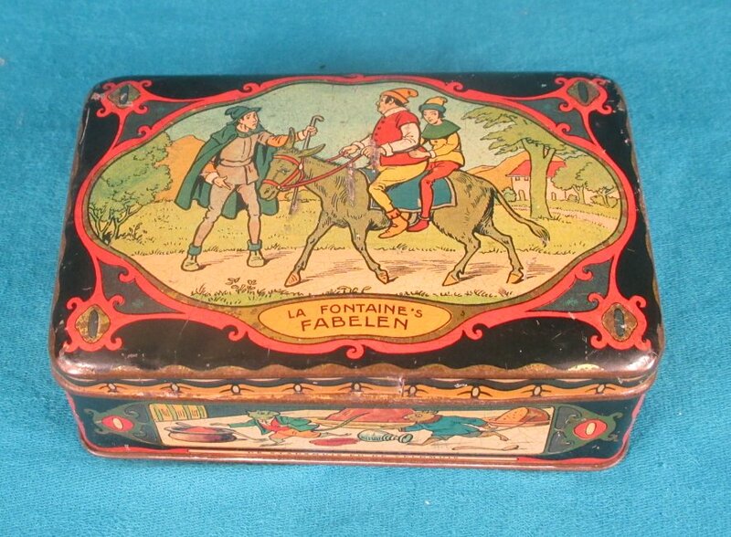 Dutch tin container with led proclaiming "La Fontaine's Fabelen" and illustrating MSA. The four sides, with scenes labeled in Dutch from TMCM, FS, "The Farmer and His Children," and FG. About 6½" x 4¼".