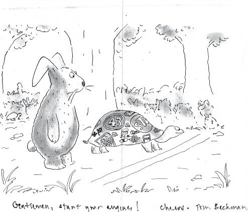 This tortoise is bedecked with all the stickers and symbols and advertisements of an Indy 500 race car. The two faces tell a lot: the tortoise is eager. The hare is surprised at the livery!