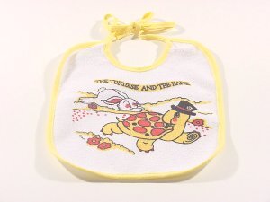 1999 Cotton baby's bib featuring the tortoise and the hare. 7½" x 8". 100% cotton terry with water-resistant vinyl plastic. Oyster Bay, NY: Baby's 'n Things. With a matching bottle $4 from C-N-C Treasures through Ebay, Jan., '01. Extra exemplar for $9.59 from Pat Zaborowski, Fernandina Beach, FL, through Ebay, Sept., '00.
