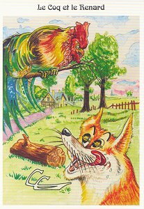 2003 Le Coq et le Renard. Colored title-card and six black-and-white postcards. Claude Coudray. Les Fables de la Fontaine. Limited edition. 2e Salon de l'Image et de l'Écrit. Montmorillon. €10 from the wife of the deceased artist at the Paris Post Card Exhibition, Jan., '05.