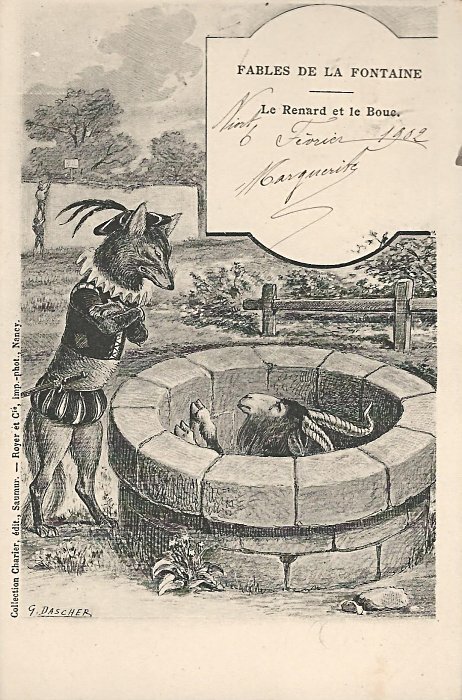 1900? 6 black-and-white portrait postcards featuring fables of La Fontaine. Signed by G. Dascher. "Collection Charier, edit., Saumur. Royer et Cie, imp -phot, Nancy." St. Ouen, August, '15. One extra copy of Le Singe et le Léopard. Extra copy of "Le Singe et le Léopard" for €7 from Bartko-Reher, April, '21.