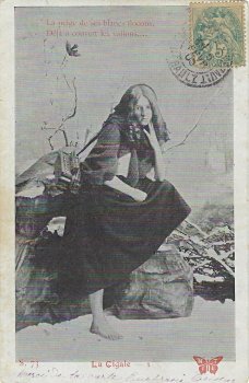2005? Set of 6 photographic postcards by Éditeur M.T.I.L (Maurice Tesson Imprimeur à Limoges) presenting "The Cicada in Winter," based at least loosely on La Fontaine's "Cicada and Ant." "S. 73." Each card has a rhyming couplet. All addressed to the same party in Hérault, France. Several are apparently postmarked "February 23, 1905." $25 from Bertrand Cocq, Calonne Ricouart, France, Sept., '20.A rough translation of the poem follows: