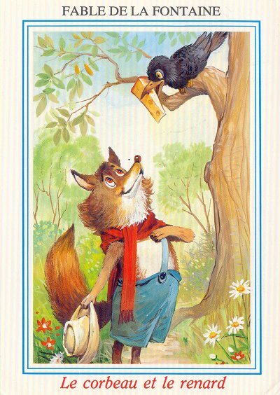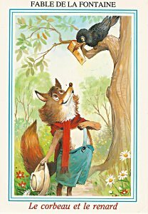 The picture side of this card presents "Fable de la Fontaine" at the top and "Le corbeau et le renard" at the bottom. In between is a colorful, if playful, children's picture of a dressed fox looking up at a crow with a wedge of cheese in its beak. The red eyes of the fox, which match his red scarf, are very expectant.