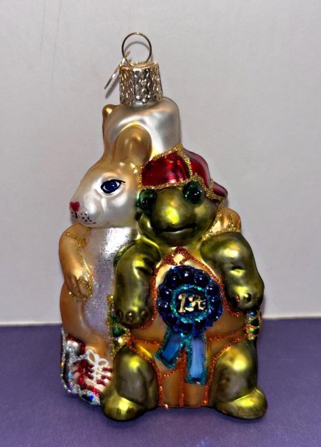 This ornament presenting the tortoise and hare as a buddies is still available on the web, I learned. The tortoise is particularly well done, with his sideways baseball cap and 1st place award. Thank you again, Meg!