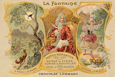 1915? Chocolat Lombart. La Fontaine: Poète & Romancier, Auteur de Fables, Contes & Novelles. La Fontaine portrait flanked by FC and MM. Paris: Chocolat Lombart. $19.50 from Alexandre Przopior, April, '00.