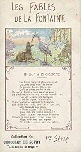 1920? "Les Fables de La Fontaine." Four slender (3" x 5½") portrait postcards with FS image and text. Collection du Chocolat de Royat. 1re Serie. One for $7 from Darren Cioffi through eBay, May, '10. Three as gifts of Bertrand Bauvais, July, '15.
