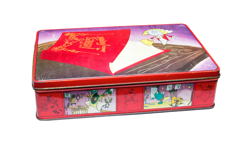 This blue tin presents FC well. On the cover is the decisive scene of the fox flattering and bowing. Just below is the scene, visible here, just prior to that moment, for here the crow is landing, and the alert fox takes notice of his arrival with the cheese. On the short side to the right the crow sings. On the longer side the fox, with cheese in paw, lectures the crow. On the last short side, the dejected crow weeps. The tin is in good condition. Dany tells me that this tin is hard to find.