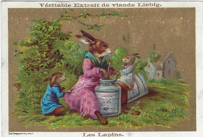 This may be our best preserved set of Liebig's first fable set. Albert has them listed as from 1883. I think the usual date given is 1884. Now I am tempted to invest in an English language set available on Ebay. The collector's urge is hard to repress!