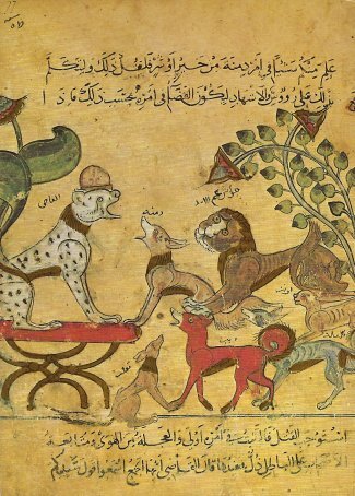 1980? Colored postcard showing “Dimna’s Trial (Fables by Bidpay, 13th cent.)”. Paris: Bibliothèque Nationale. Munich: Aries-Verlag. £.99 from catsmelanie on Ebay, Feb., ’21.