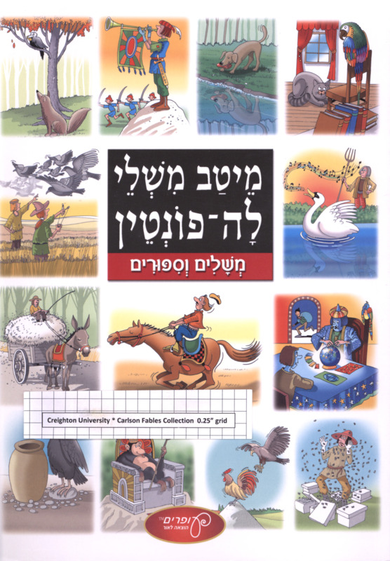 The middle-aged couple has gone out leaving grandpa, their child, and three dogs at home. The child has used his car to pull a pulley around the lamp to raise grandpa up so that he can get at the jar of sausages on top of a cabinet. I wish I could make out the rest of the artist's name after "Jean du." Nice use of color! I am surprised at the English translation of La Fontaine's moral.
