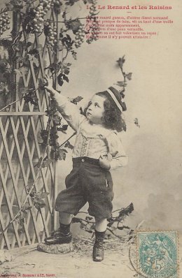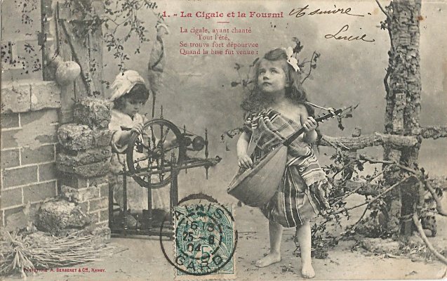 The five scenes in these postcards, acted by children, communicate a severe handling of the cicada. In the last scene, she is lying disconsolate as the "ant" directs her to go dance in winter. Spinning wheel and guitar characterize these two. Each card's front contains a few verses of the fable in red. I am amazed to have found a full set of these cards through the generosity of Bertrand and his family. Bergeret apparently moved out to present one fable in a series of photographs after offering a series of fables with one view each.