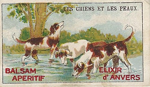 This series is identical on its picture sides with Gallaher cigarette cards. I give an example here of the new advertising title superimposed on the picture. Two cards are missing: #2 and #67. Each verso mentions "F.S. de Beukelaer, distillateur Anders." I have trouble tracking down both Beukelaer and Anders. For images of the cards in this series, see the Gallaher cards. An anomaly is that the first card, pictured here, is not numbered on its verso as are all the others.