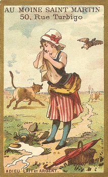 The milkmaid here is a young girl carrying an umbrella and a basket in addition to the jug on her head. The card seems to have some text cropped, though the borders on the image side seem appropriate as the card is.