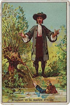 Very pleasing cards, with better illustration work than on many such cards. The framing of the picture is done well, with a flowing ribbon moving up from the Aiguebelle credit at the bottom alongside the illustration and fable title and past the "Fables de Florian" group title at the top of the card. The verso presents the full fable text. The coloration reminds one of the coloring of fine "holy cards" in one-time Catholic grade schools.