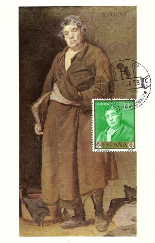I had not known that there is a Spanish stamp commemorating Aesop. If anything, the green stamp is clearer in its detail than is the colored reproduction of the painting. I will put the postcard with stamps and mail.