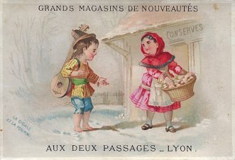 1890? 1 French full-color card using a young girl to depict La Fontaine's MM. 3" x 4 3/8". The fable title is at a 45° angle in the lower left corner. "A la Samaritaine" is on the picture side and, along with the fable's text on the verso of the card, there identified as "Magasin de la Samaritaine." 2 Euros at Clignancourt, June, '07.
