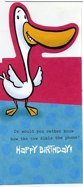 The front side of this card tells a story about a rowdy birthday party among ducks. Cows in a neighboring barn called the police. The front of the card asks "Would youlike to know the moral of this story?" The inside of the card then asks "Or would you rather know how the cow dials the phone?"