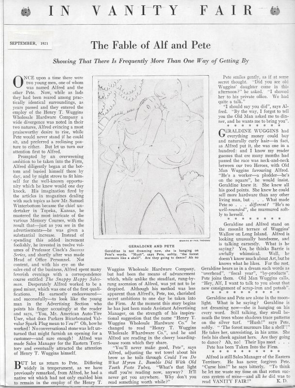 An original fable in the magazine “Vanity Fair”. The author's initials are K.D. The title states “The Fable of Alph and Pete; Showing That There Is Frequently More Than One Way of Getting By.” A print of a picture titled “Geraldine and Pete” accompanies the story. The visual artist’s name is Paul Thevenaz.