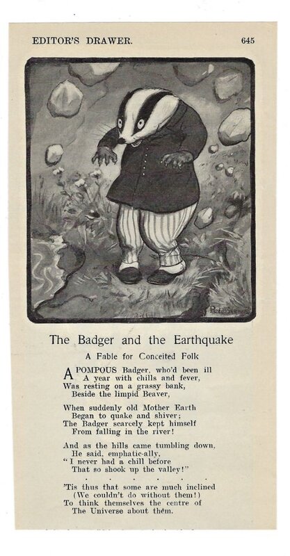 1905 "The Badger and the Earthquake: A Fable for Conceited Folk," , p. 645, Harper's New Monthly Magazine, March 1906. “Editor’s Drawer.” Image by Peter Newell. $3.50 from woods elf through Ebay, May, ’06.