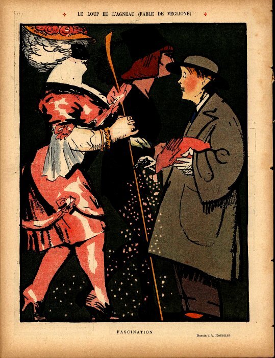 1911 "Le Loup et l'Agneau (Fable de Veglione): Fascination." A. Roubille. Le Rire No. 428, April 15, 1911. 9" x 12". €10 at Clignancourt, July, '19.