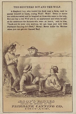 BW is a card poorly cropped by the printer: some of the next card down shows through, and the top margin is not complete here. For that reason, I have been happy to find a better copy and to present it below the original for comparison. In this version, the boy as usual cries "Wolf!" and means it after tricking people several times. They answer "Look out for your own mutton, we are busy just now with Fairbank Canning Co's Beef." "Moral: Never holler for Mutton when you can get our Canned Beef." This card, which may complete the set, came with a number of others from Betsy Cotter, Tonawanda, NY, through eBay, Feb., '12. Better copy for $5.95 from Jacqueline Luzusky, Pinehurst, NC, through Ebay, March, '20