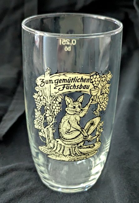 Maybe best translated "At the cozy fox's den." This standard German wineglass led me to try to pin down which Fuchsbau might have used this glass. There are too many Fuchsbaus in Germany! Foxy bars and restaurants can have trouble keeping the fox away from the out-of-reach grapes!
