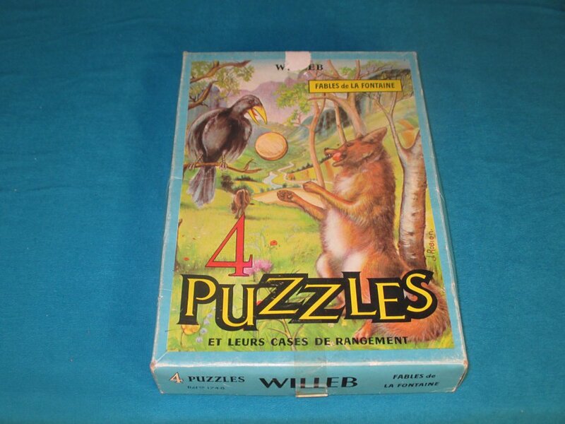 1960? Box of 4 "Fables de La Fontaine" cardboard puzzles. TH; FC; GA; and MM. Artist: J. Robion. Willeb Ref. #1748. €12 from lesvieuxbidules through Ebay, Sept., '20.
