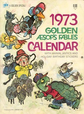 1973 The Golden 1973 Aesop's Fables Calendar. Pictures by Mel Crawford. A Golden Calendar. NY: Western Publishing Co., Inc. Gift of Barb Markuson, Glenwood, Iowa, April, '15. Extra copy in poorer condition for $6.99 from Leah Fowler, Edgewood, MD, through Ebay, March, '99.