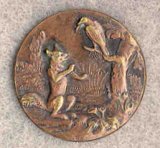 1930? 7" white plate from Sarreguemines, France. Inside a 1.5" rim there is a portrayal of "The Fox and the Cat." The front carries two inscriptions: "Fables de la Fontaine" and "Le Chat et le Renard." The back has, in sketchy form, "Fables de la Fontaine" and "Digoin/Sarreguemines/France." $23.49 from Lea Belew, Beeville, TX, through Ebay, Oct., '00.