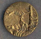 Though this theme of the eagle and stag is listed as a standard button motif, I have no idea what the fable is that is depicted! This button is a bright, very shiny brass piece folded over a different back with yet a third independent piece forming the shank. Help?! BBB shows a similar motif in an apparently smaller button (Plate 154 #27), and for #5 on Plate 153 describes the following story from Pilpay. A stag led his family on the search for food and water. As the land became unfamiliar, he told the females and young deer to wait in hiding. An eagle called to the stag to ask where his family was hidden, saying he wanted to lead them to food and water. The stag recognized the eagle's intentions of capturing a young deer for himself and declined to reveal their whereabouts. In a footnote, BBB gives Madge Valgamore as their authority and note that they could not find this story in any edition of Pilpay. Regretfully, Mrs. Valgamore had not given a reference. So still I say: Help?!