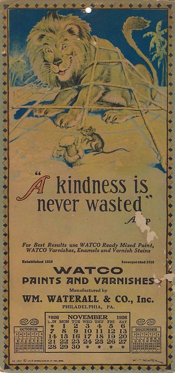 1926-27 Watco Paints and Varnishes. Five calendars from November, 1926 through December 1927 quoting Aesop. Designed by Milo Winter. $60 from snydersjunkyard, Pennsburg, PA, through Ebay, Dec., ’24.