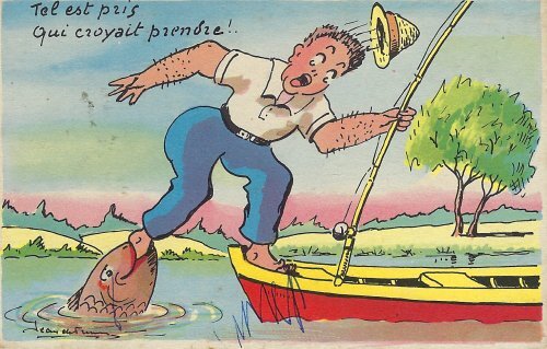 1955? Tel est pris qui croyait prendre. Fisherman caught by a fish. $5 from an unknown source, Feb., '22.