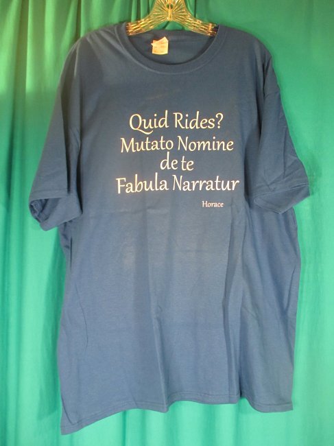 2020 T-shirt featuring "Quid rides? De te fabula narratur" from Horace. Short sleeves. $22.99 from Goathead Tees, Brown City, MI, through Etsy.
