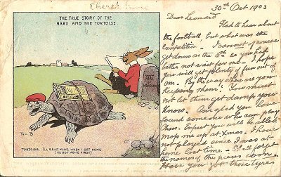 1903 Colored picture postcard with a humorous take on TH. "The True Story of the Hare and the Tortoise." $14.01 from Marilyn Lamkin, Lexington, MA, through eBay, August, '02.