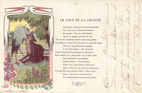 1920? Postcard presenting La Fontaine's FC text beside a colored illustration. A. Storck & Co. Deposé. 50 Francs from Annick Tilly, Clignancourt, July, '01.