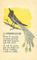 1955? Five different Italian postcards with verse text and colored picture on one side and room for a message and address on the other. 3 3/8" x 5 3/8". Though the card stock is cheap, the color work is very nice. It seems to involve about four colors per card. The visual works are signed by "stefanini" (?). Studio Stefan. A cura dell'Associazione Cardinal Ferrari. 10,000 Lire each at the Porta Portese flea market, August, '98. One extra of "La Cornacchia Superba." Click on any image to see it full-size.
