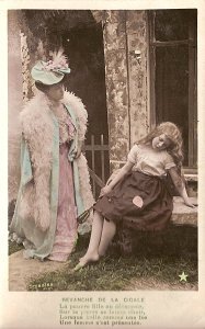 Series #3046 is five cards on the cicada's revenge on the niggardly ant. The story follows up on Series #3045, "La Cigale et la Fourmi." The cicada character is the same in all cards of both sets. Here the rejected cicada finds a fairy godmother who trains her musically. The cicada, now rich, returns to the ant, who has been thrown out of her home and needs to sell everything. The ant is the same actress as in the other set, and the venue is the same, except for the "For Sale" sign here. The gracious cicada takes no revenge but rather opens her purse for the unfortunate ant. There is extensive pink and green coloring of these black-and-white pictures. I wonder how that was done.