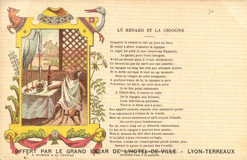 The illustration here is unusual in that it has the stork standing on top of the table holding the meal. The elongation of the image helps to reinforce the point of the fable. The fox's legs seem to have become quite human in their pose. The frame of the image includes heads of both principal figures. This card is stamped "Offert par le Grand Bazar de l'Hotel de Ville, Lyon-Terreaux." I guess you could use the card to write home about the glories of this hotel.