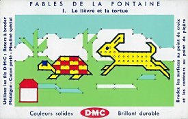 1965? Set of 20 embroidery stitching cards plus four extras. Complete set. Fables de La Fontaine. Numbered 1-20. DMC $28.68 from Boulot Dodo, Avignon, France, through Etsy, Jan., '19. Thirteen duplicates for $94 from Bertrand Cocq, Calonne Ricouart, France, Sept., '18.