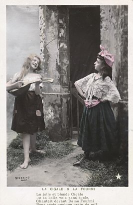 1905? Complete set of five photographic postcards presenting "La Cigale et la Fourmi," VBC Series Number 3045. Stebbing Photographic Studios. Five cards and two extras for #35 from Bertrand Cocq, Calonne Ricouart, France, Sept., '18. Extra of the first card in the series for $3 from Elsa Pinto, Paco de Arcos, Portugal, June, '13. Extra of #5 for $1.50 from Joachim Montbord, La Sauve, France, through eBay, March, '04.
