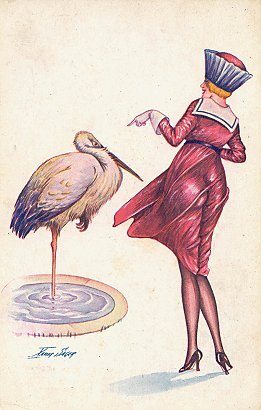 I am not sure that I have ever read a fable of the swan and the crane. Once I learned that "grue" means not only a crane but a prostitute, I am not sure that the artist had ever read one either! In any case, a crane in a very small pool eyes a jauntily and thinly clad young woman. I never thought I would have one of "those" French postcards in this collection!