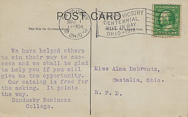 1912 Penny postcard using TH and the month of May 1912 to advertise Sandusky Business College in Sandusky Ohio. The card was mailed to Miss Alma Dobrontz of Castalia, Ohio. Unknown source.