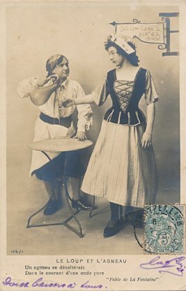 It can be hard to understand the interpretation and the sequencing of this story as it is presented here. The problem is exacerbated by the fact that, on one card, the stamp covers the card's numbering. The other three cards are all in Series 175 and are numbered 1, 3, and 4, respectively. A major clue toward resolving some of the quandary comes in recognizing that this card changes La Fontaine's text at a crucial point. La Fontaine starts his fable with the promythium that the argument of the stronger is always the better and then says immediately: "Nous l'allons montrer tout à l'heure": "we will show that right now." The card with a hidden identifying number has rather "Nous l'avons montré tout à l'heure": "we have shown that right now." I presume therefore that this is the last card in the series. I still have trouble understanding the role of the male in the first and last photos. Is he just a friend sympathizing with an abused maid? What does his gesture portend in the last photo?