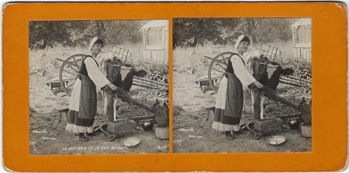 This set starts with Perrette attending the cow on the farm. In #2 she milks the cow. In #3 she has her pot of milk in her hands before she departs. In #4 she is proceeding down the road to market. In #5, the pot has fallen and is smashed, and her milk is all gone. In #6 she laments her loss. These stereopticon cards are in good condition! Do we have the same actress as Perrette here, the ant in GA, and the home dove in "Two Doves"? And is she wearing almost the same costume?