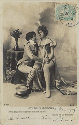 1904? Les Deux Pigeons. Set of 8 numbered photographic postcards by S.I.P. 105/1-8. $5 each from Bertrand Cocq, Calonne-Ricouart, France, Sept., '20.