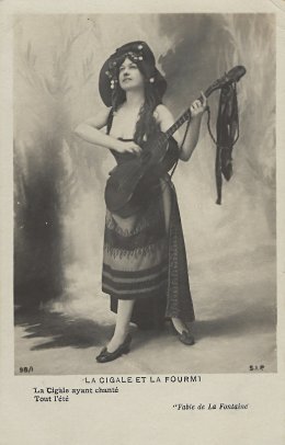 This set starts, unusually for French postcard presentations, with the countryside as the venue for the grasshopper's encounter with an ant. The time is summer. The ant works the soil. The grasshopper is lavishly dressed. And she plays music happily. Suddenly it is winter. With hat in hand, she knocks at the ant's (barn)door. The ant opens, and the grasshopper extends an open hand in request for food. The ant rejects the grasshopper, telling her to go dance.