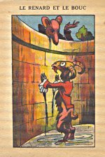 1950? This complete set of 84 cards was a special find on a January day when I was passing through Paris. I stopped at a postcard show. As I was leaving, I asked a vendor whom I had not met if she had any fables. She asked "Including complete sets?" I was thrilled to find this set of postcard-sized trade cards, which advertises at the bottom of each text page "Les Gaufrettes Rivoire & Jeandet - Tarare." $120, Jan., '05. An extra copy of #75, "Un Fou et Un Sage," for €5 at St. Ouen, June, '19. Click on an image to see a larger version. As it happens, I have a blotter advertising this set of cards. The unusual presentation of #5, "The Fox and the Cock," made me check back; sure enough that image advertised this very set of cards.
